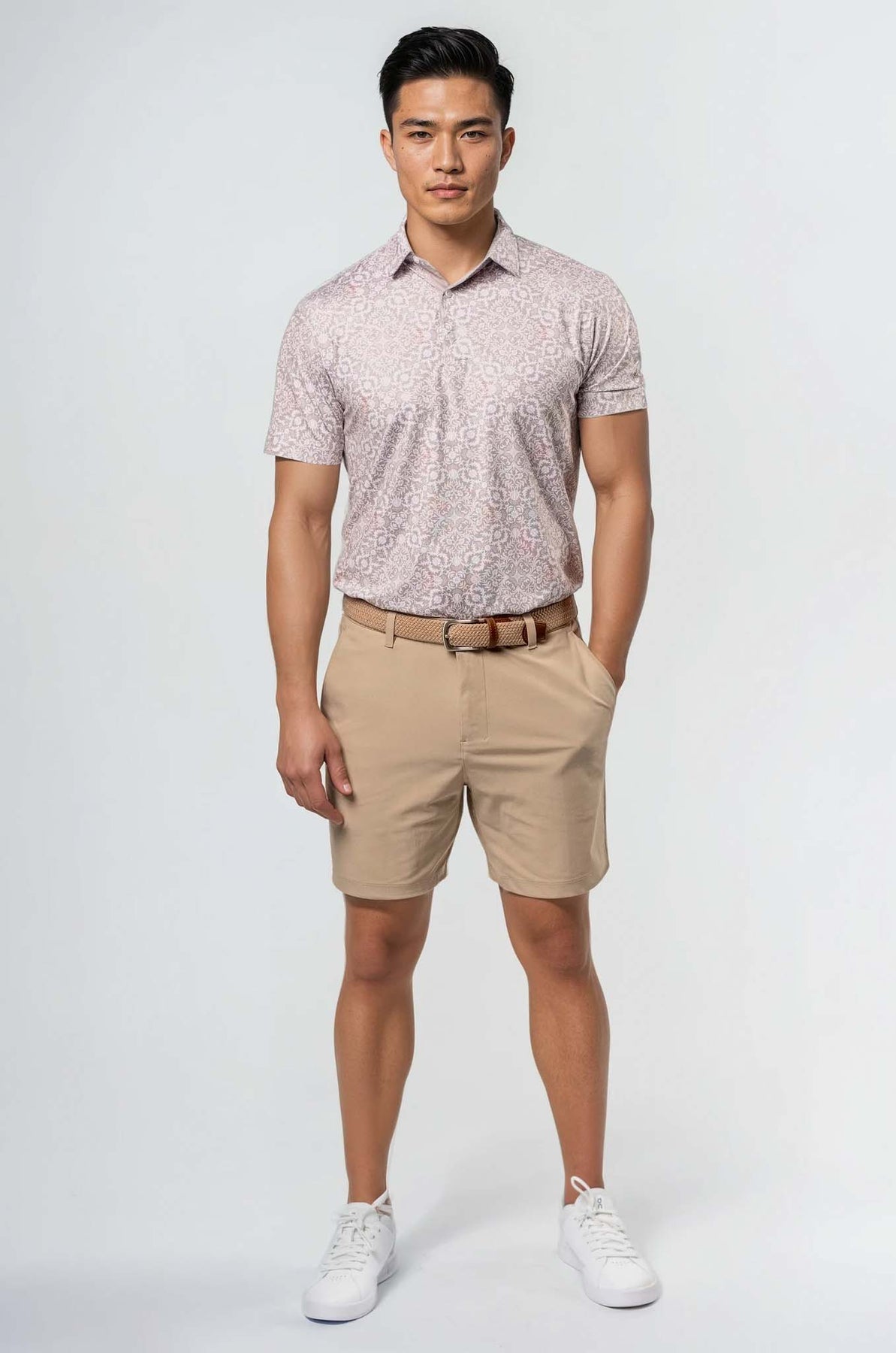 This men's polo features a sleek geometric pattern that blends sharp lines and subtle shapes, creating a modern yet refined look. The design adds depth to the classic silhouette without overpowering it, offering a perfect balance of style and sophistication.