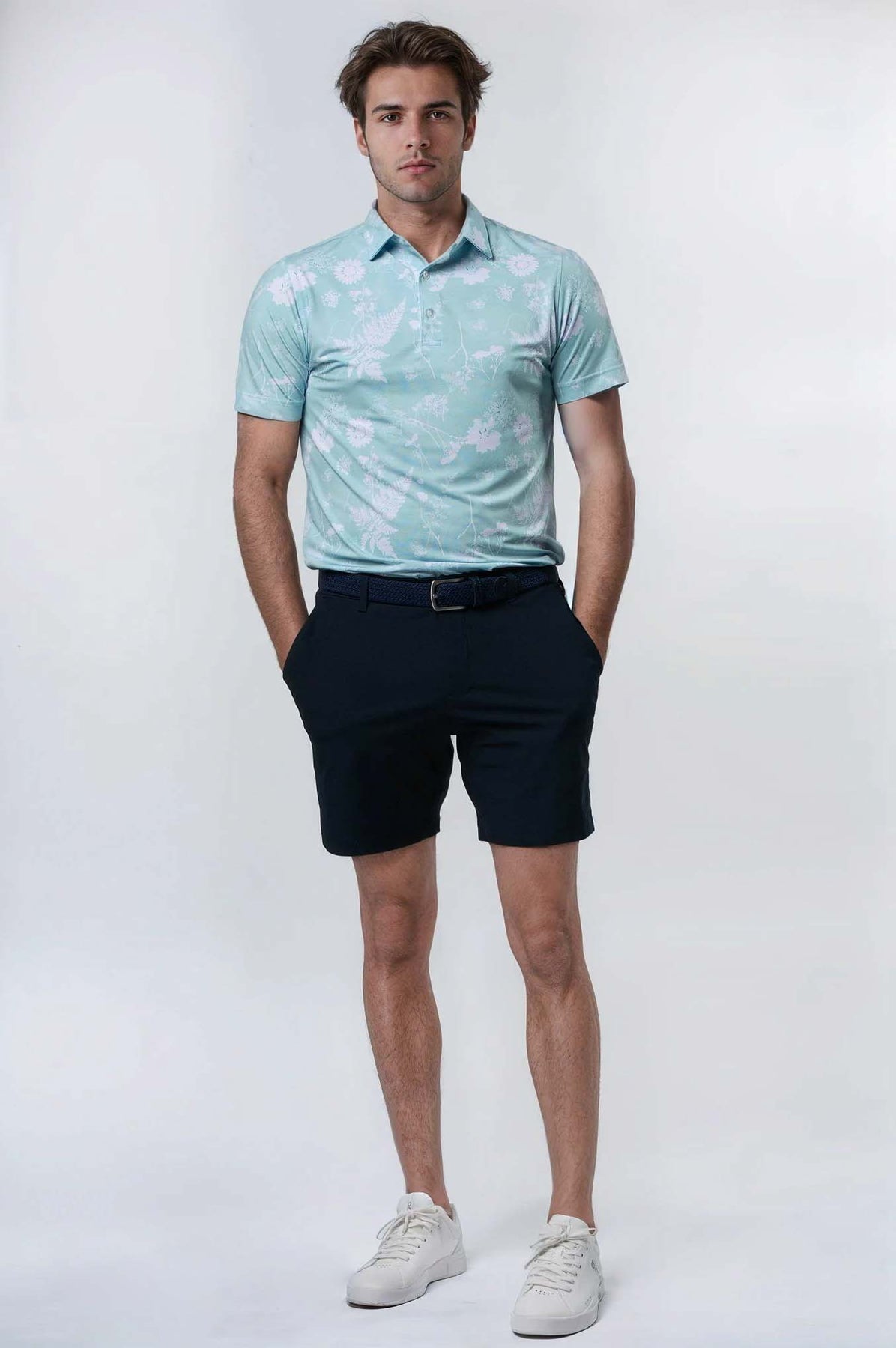 This polo in light blue features a bold cyanotype-inspired imprint of foliage, blending nature’s intricate designs with a modern edge. The deep cyan tones and strong, abstract patterns create a unique visual texture, adding a touch of artistry without compromising on strength and sophistication.