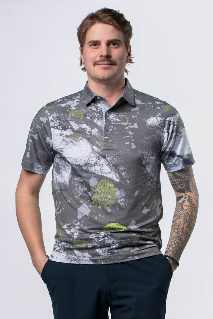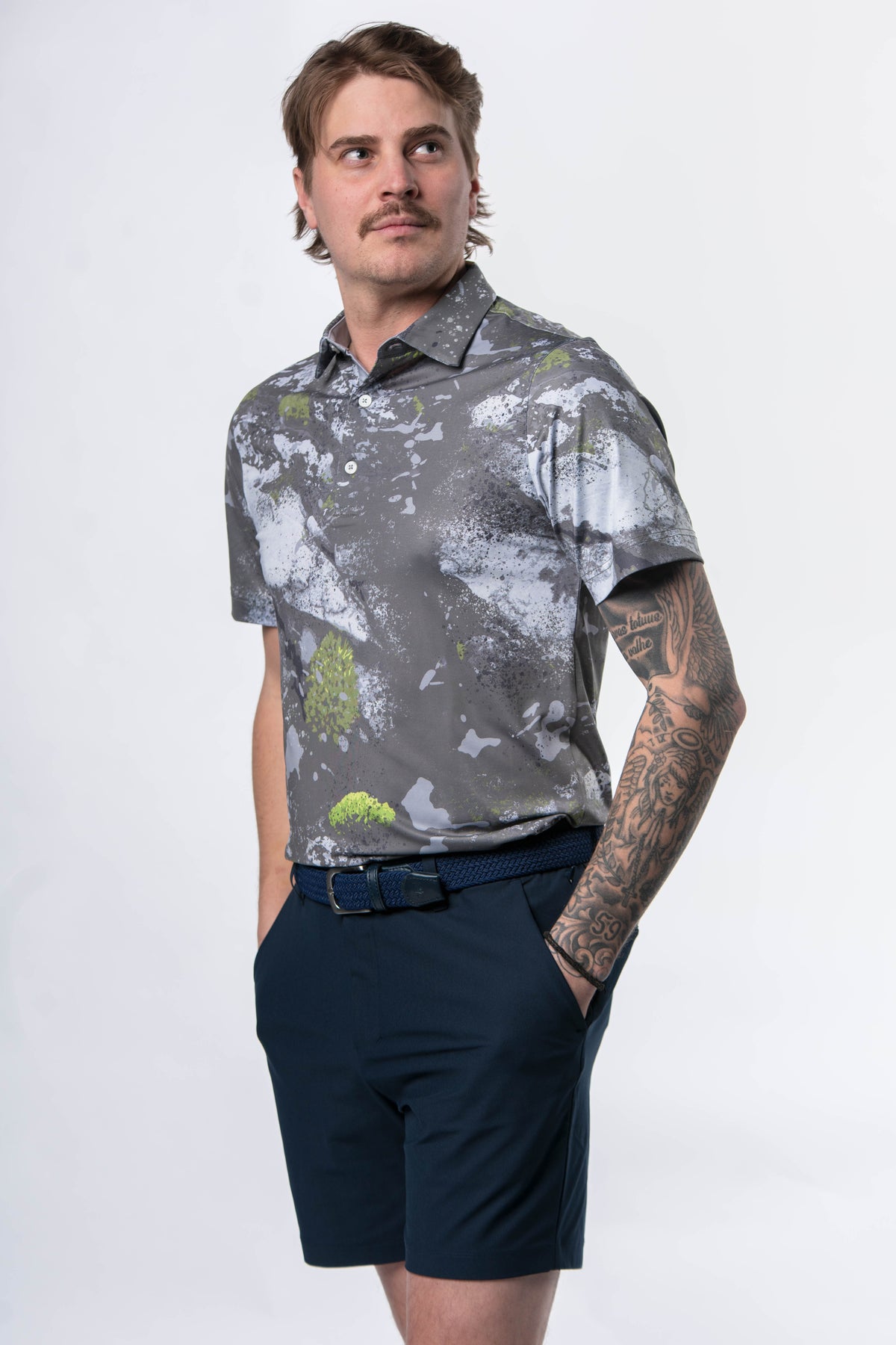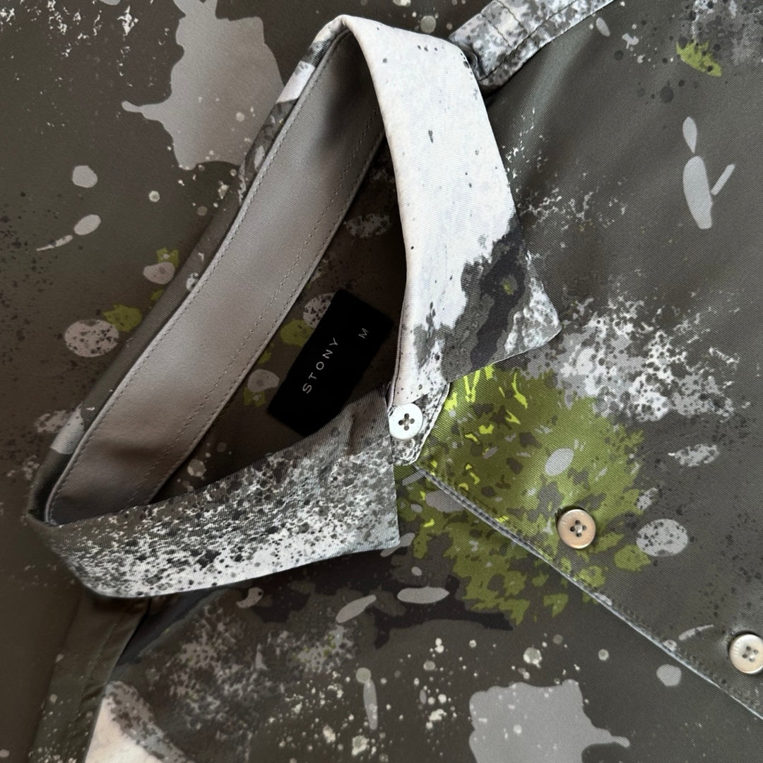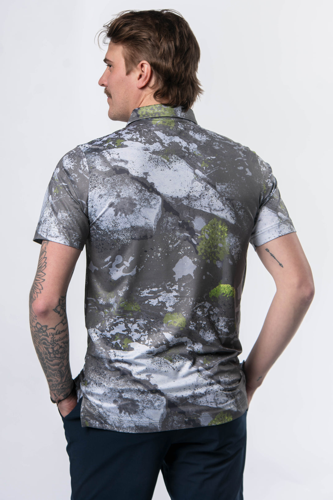 An artistic approach to the Cambrian Shield, accentuated by vibrant pops of green moss, and infused with subtle details mirroring the textures of organic elements and exposed rock. This unique print creates a harmonious blend of nature inspired elements and contemporary design.